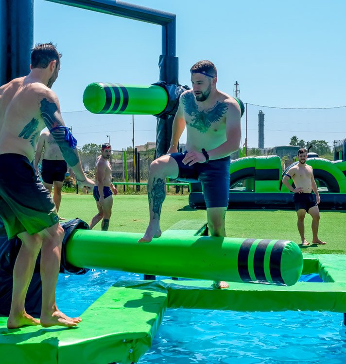 Inspirado en el mítico programa japonés, nuestro circuito está diseñado para que cada minuto sea una carcajada. Saltos imposibles, carreras sobre colchonetas, luchas con churros gigantes, pasarelas resbaladizas, caídas al agua y muchas sorpresas más… ¡No podrás parar de reír!