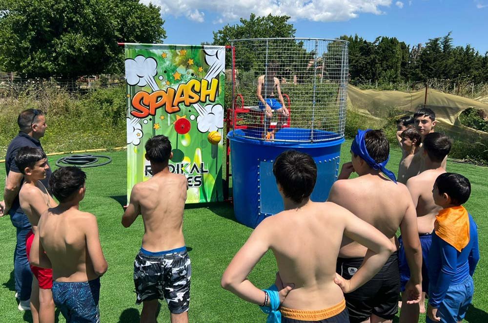 Lanza la pelota, acierta en la diana… y ¡boom! la persona sentada en la plataforma caerá al agua en un chapuzón épico.
